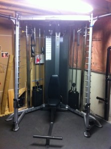 The Nautilus system I bought was actually very clever, as it combined a smith machine with a plate-loaded cable system with multiple positions for the handles. Here’s a picture of it just after I put it together: