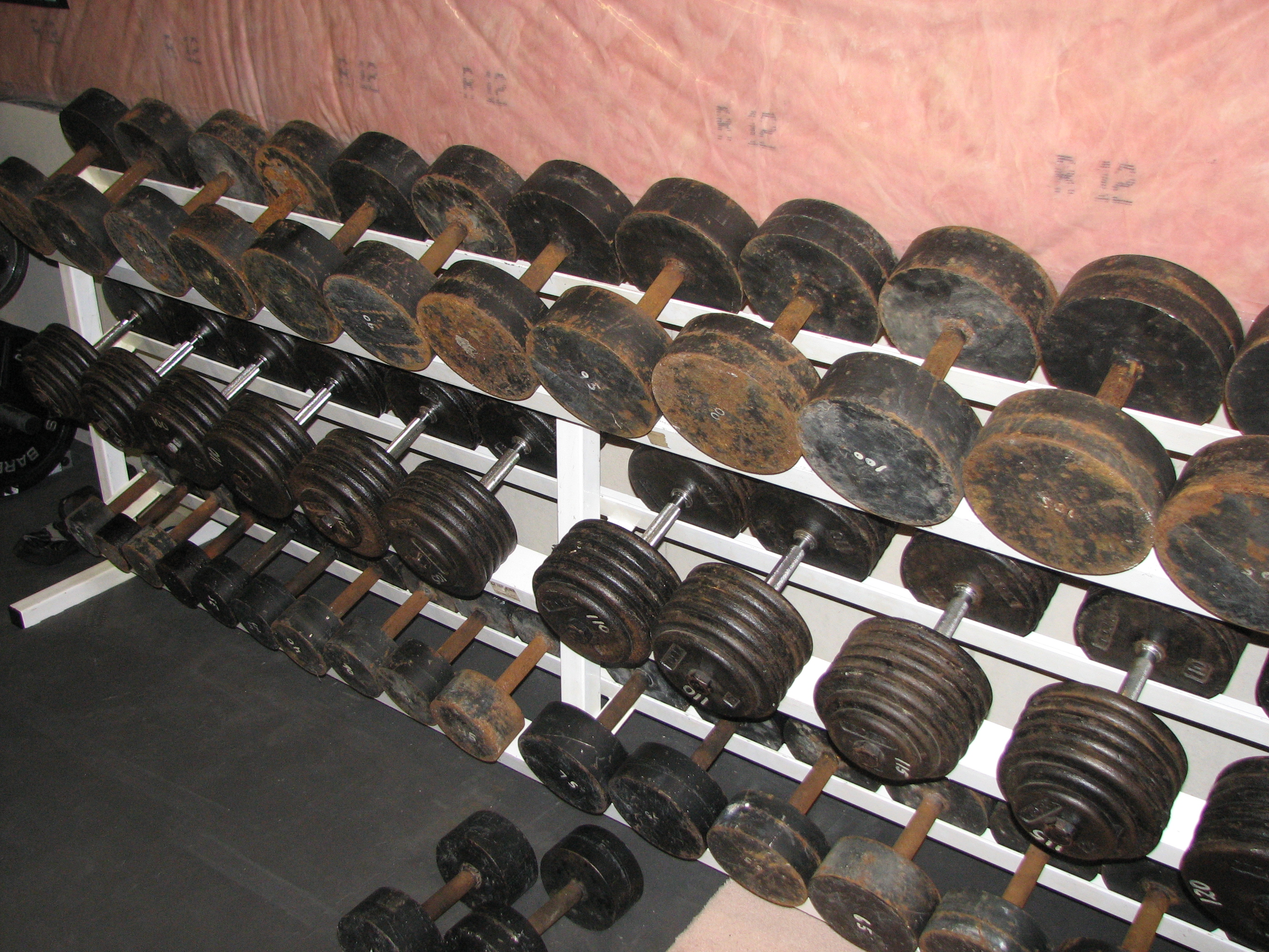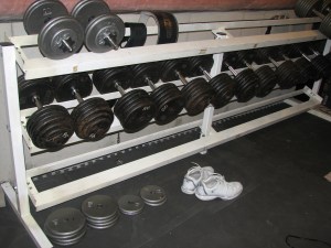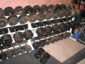 Once they were down my rack was finally put to full use. Here’s a pic. I had originally intended to restore the dumbbells by removing the rust and repainting, but to date I have not had the time or inclination, and the dumbbells work just fine anyway.